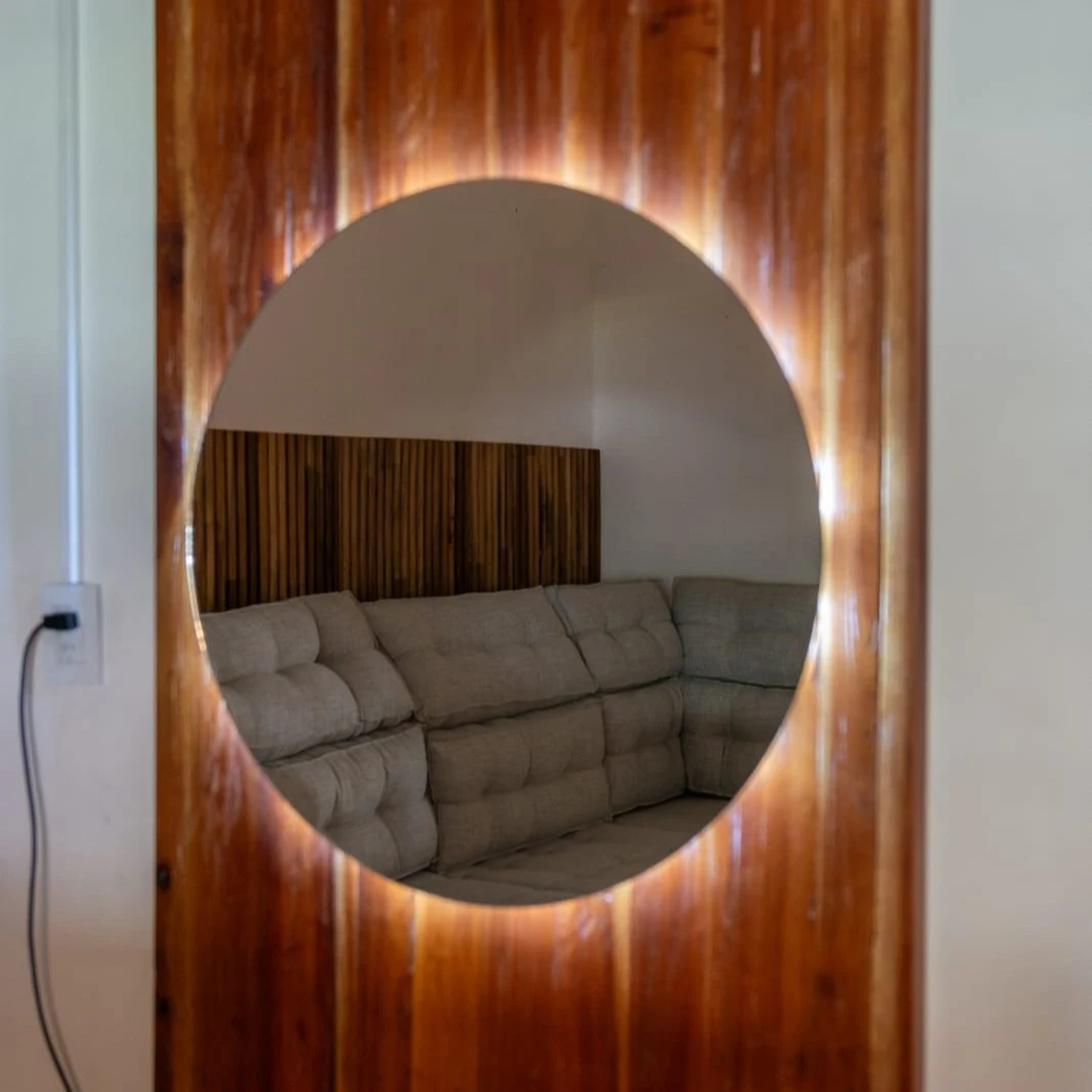 Espejos redondos con marcos en madera enarenada de cedro con luces led (incluye enchufe y botón de apagado y encendido)