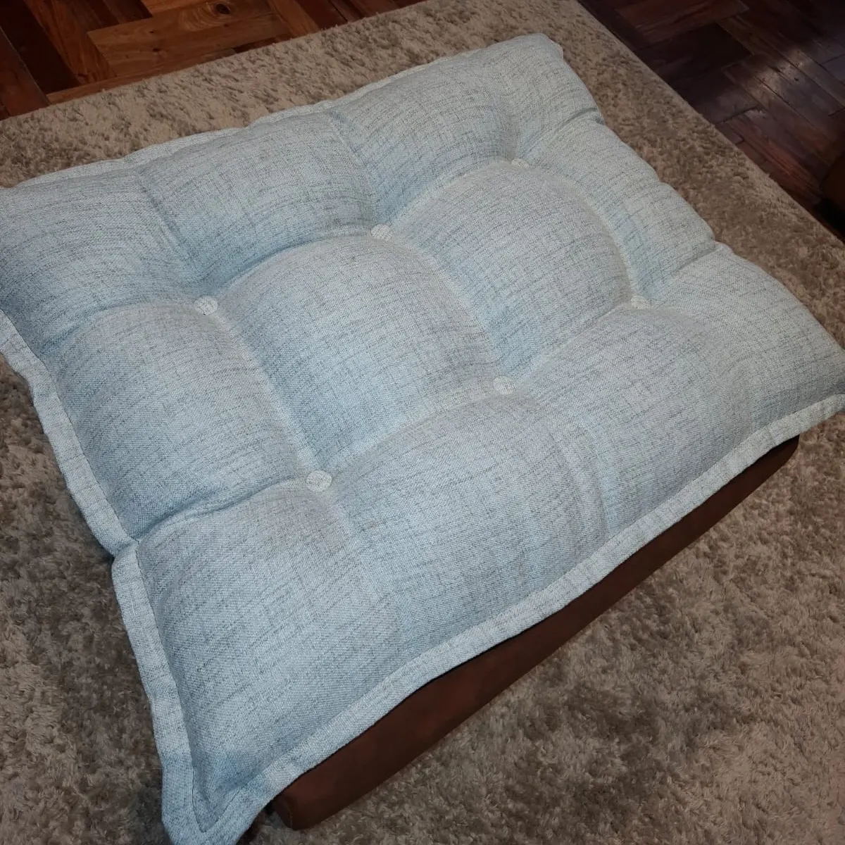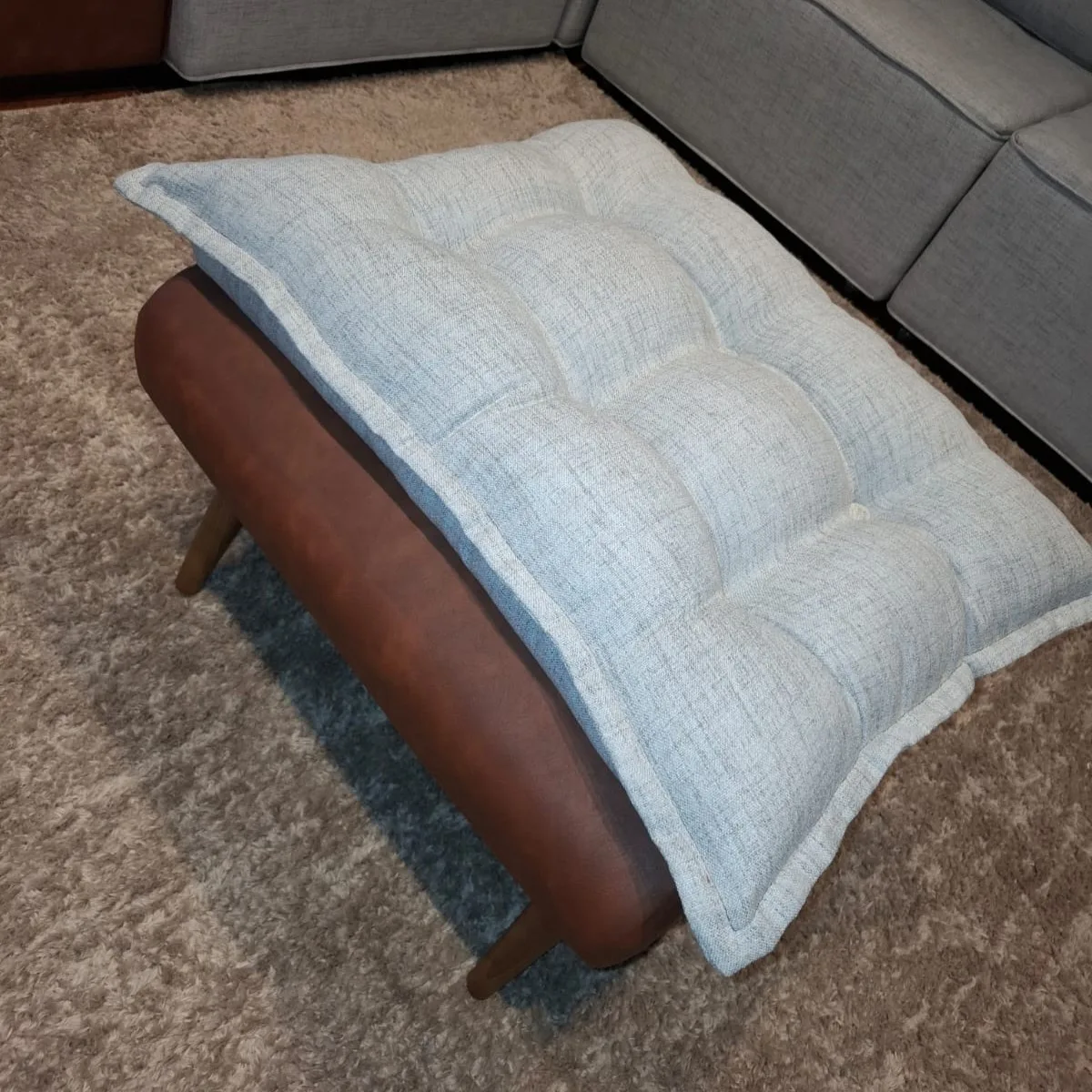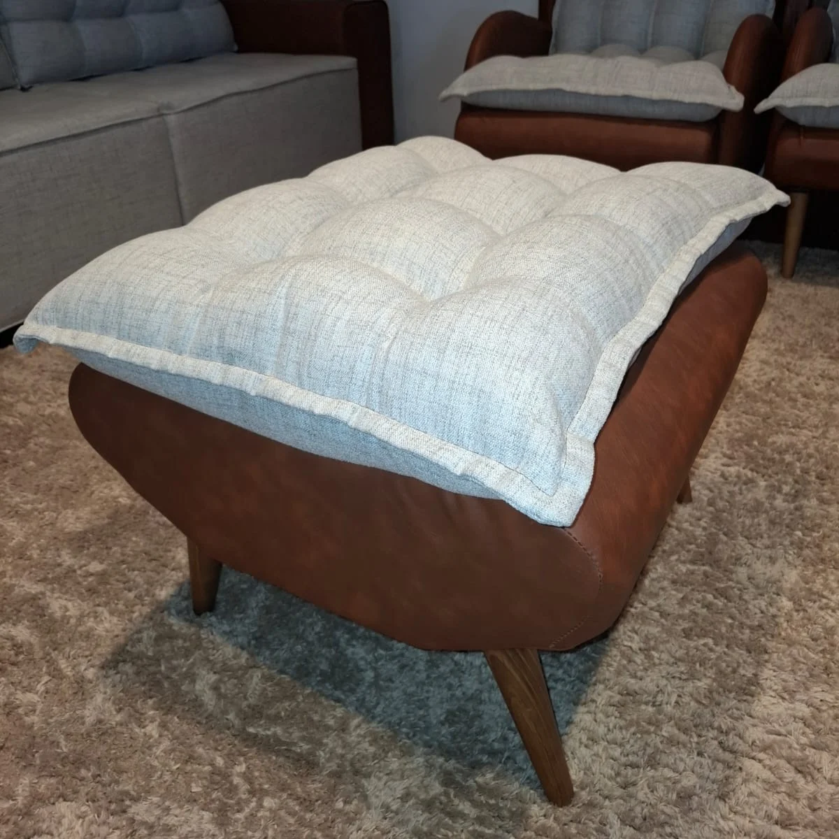 Puff con 4 patas de madera importada torneadas y tapizado en lino y cuero tex.