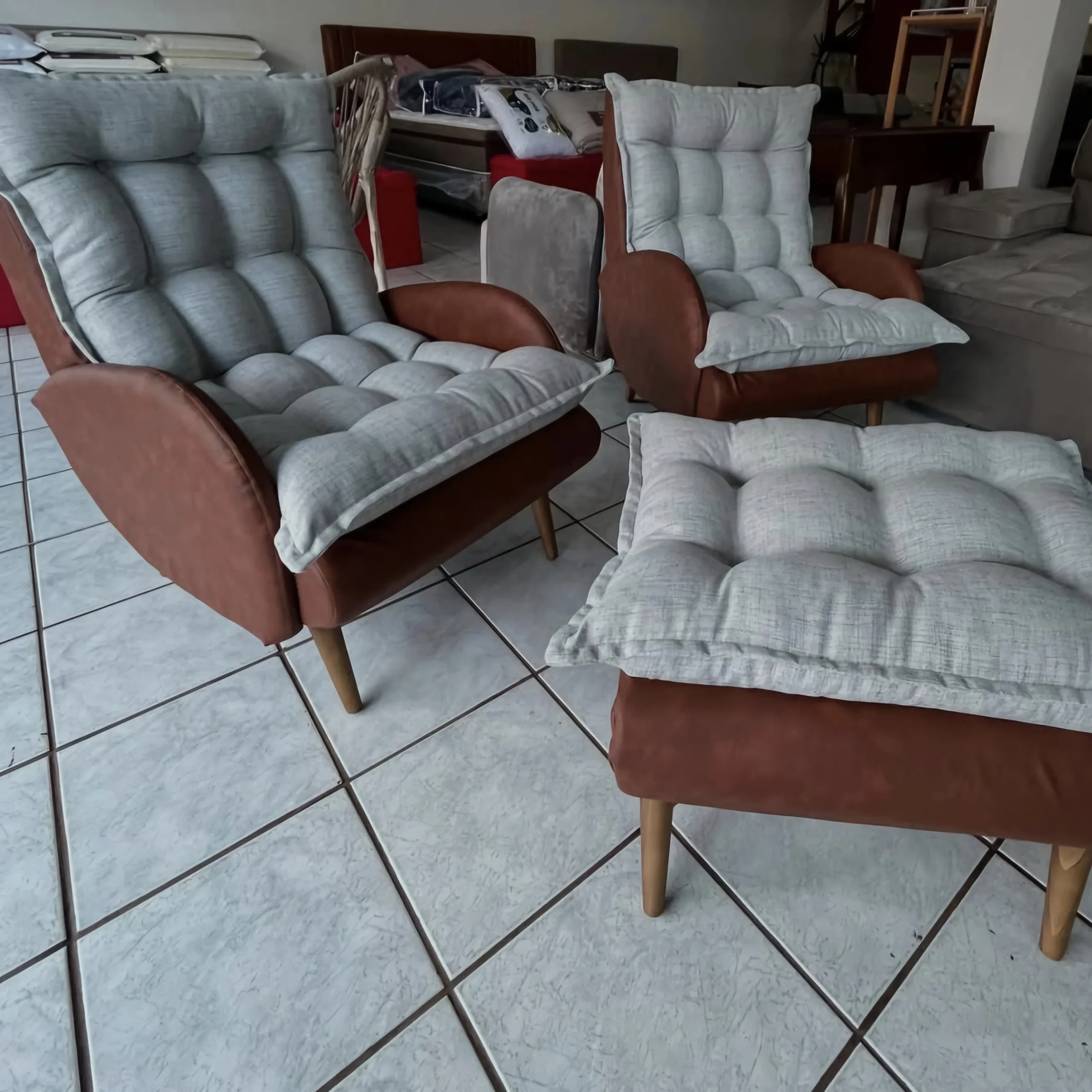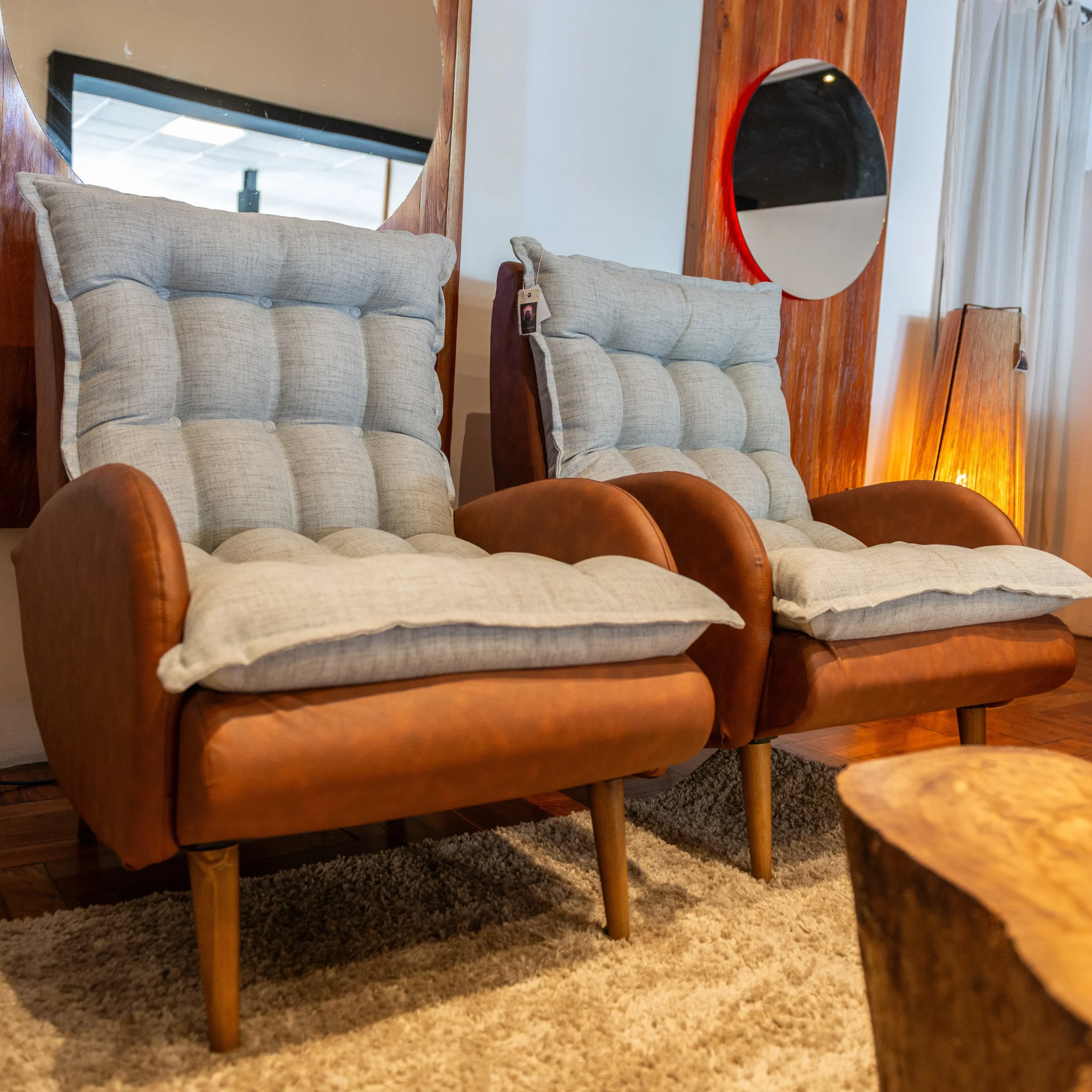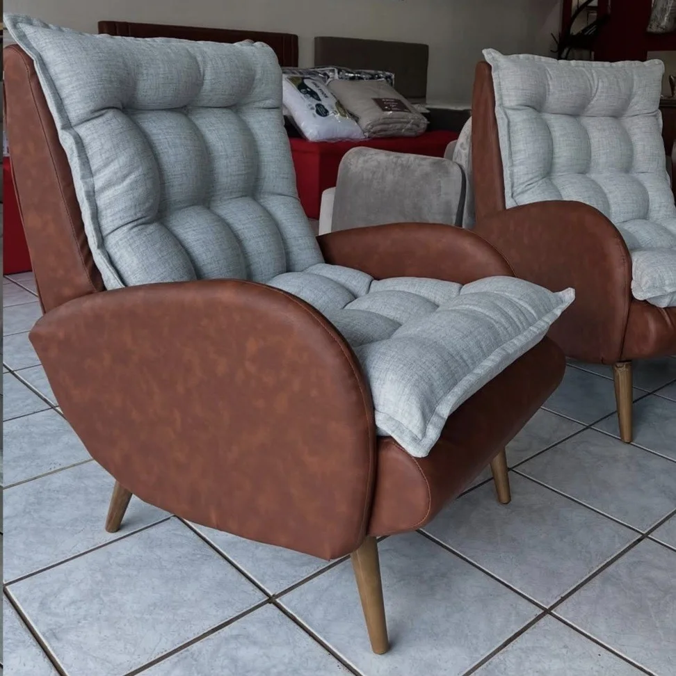 Juego de 2 sillones poltrones, son importados están hechos con soft de alta densidad con un super confort para descanso y muy delicados. Están tapizados con tela de lino anti manchas y los costados con cuero tex color zuela patas en madera importada